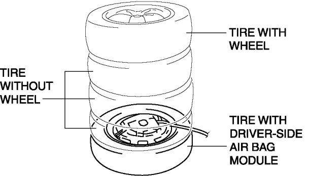 5. Stack the tire with the passenger-side air bag module on top of two tires without wheels. Stack a tire without a wheel on top of the tire with the passenger-side air bag module, and then stack another tire with a wheel on the very top.