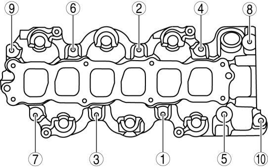 Tighten the intake manifold installation bolts in the order shown.Tightening torque 8.5-11.5 Nm {87-117 kgf-cm, 76-101 in-lbf}