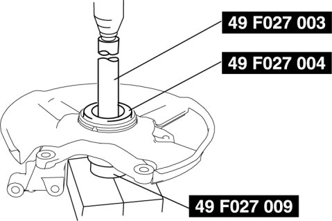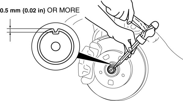 2. If the bearing inner race remains on the front wheel hub component, grind a section of the bearing inner race until approx. 0.5 mm {0.02 in} remains. Then remove it using a chisel.