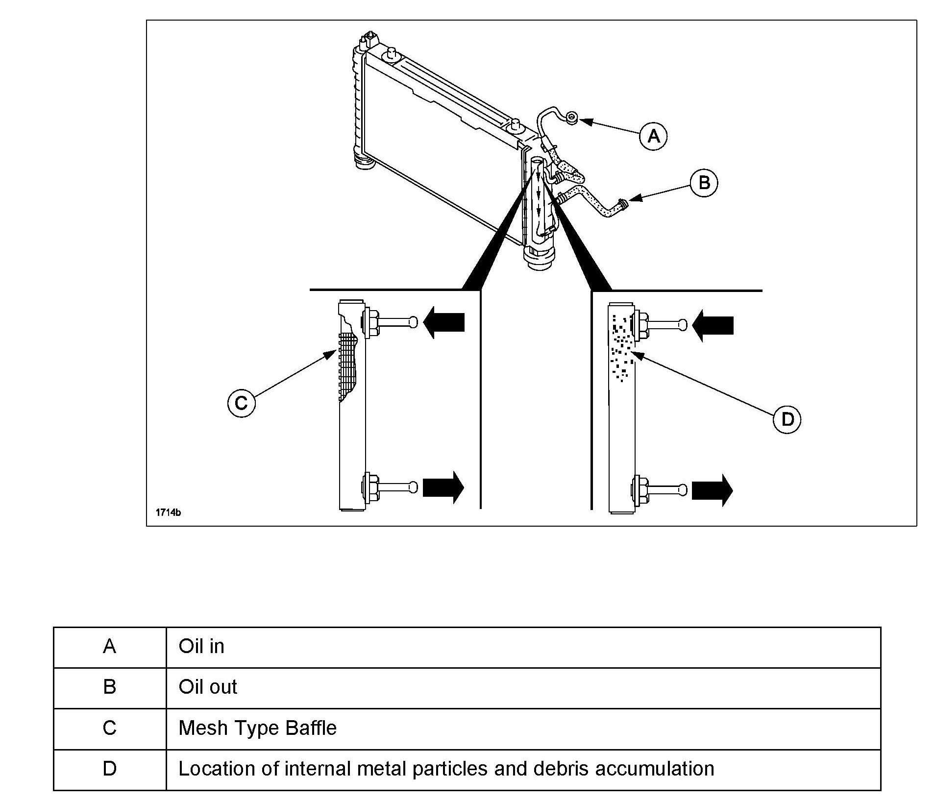 Before power flushing, inspect the hoses/lines and clamps on the vehicle. Repair or replace as necessary. Power flushing must begin with back flushing, followed by forward flushing to dislodge a restriction, then back flushing again. If back flushing is not performed before forward flushing, the restriction could further reduce the automatic transmission fluid (ATF) flow through the internal mesh type baffle (C) of the cooler and flushing will not be effective or possible.
