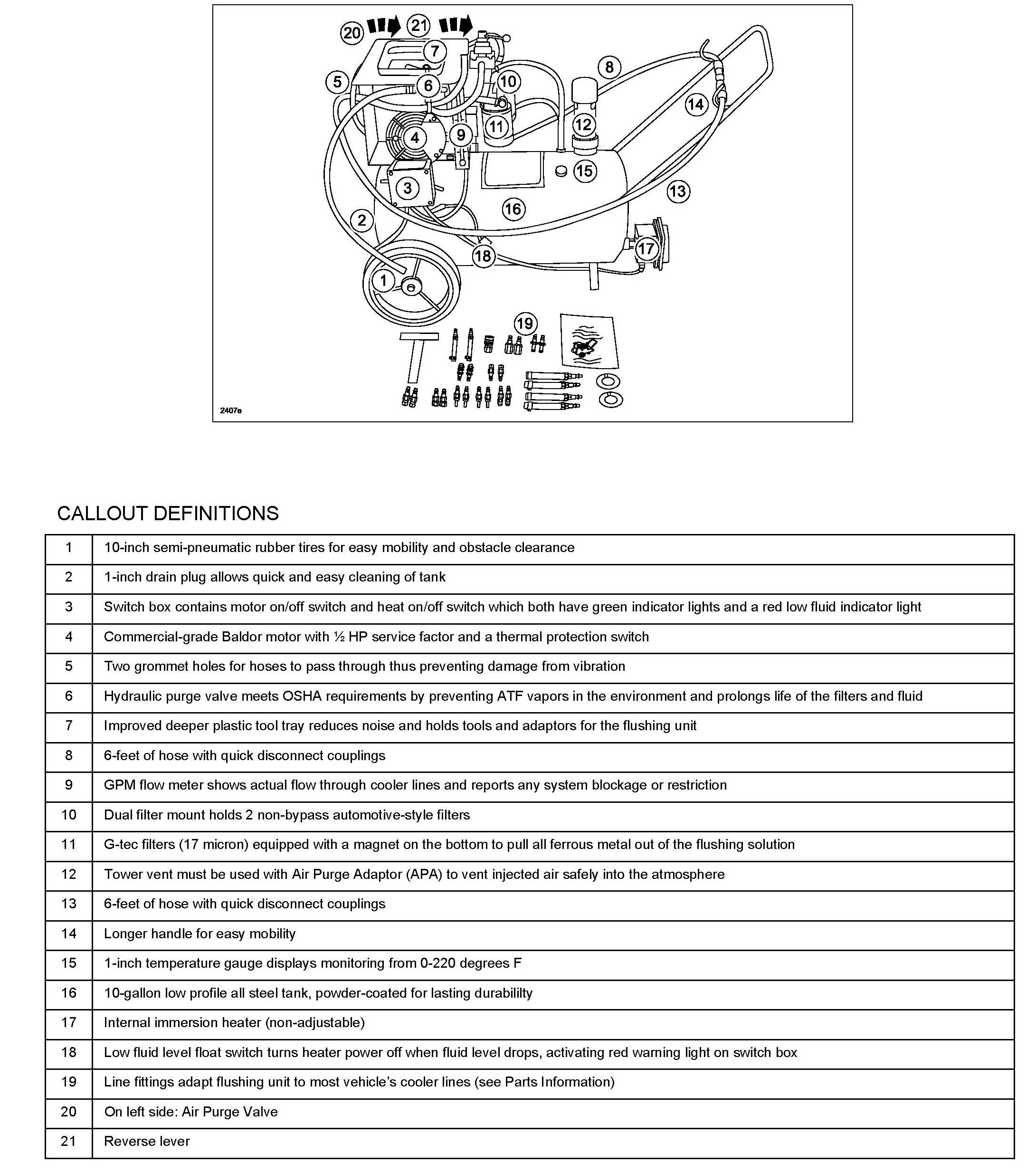 13. To change flow of the cleaning process for forward flushing, turn the reverse lever (callout # 21) to the opposite setting, ie: position 1". Turn the motor switch ON and let the flushing unit forward flush for 5 minutes. Regulate the air supply to 90-100 psi. Also verify the flow meter (callout # 9) reads a minimum 3-4 gpm for proper flow. While the flushing unit is running, open the air purge valve (callout # 20) for 10-15 seconds to cause agitation and improve the flushing process. Then close the air purge valve.