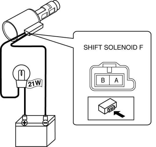 1. Connect the positive battery terminal to terminal B of shift solenoid F via the 12-21 W bulb and connect the negative battery terminal to terminal A of shift solenoid F.