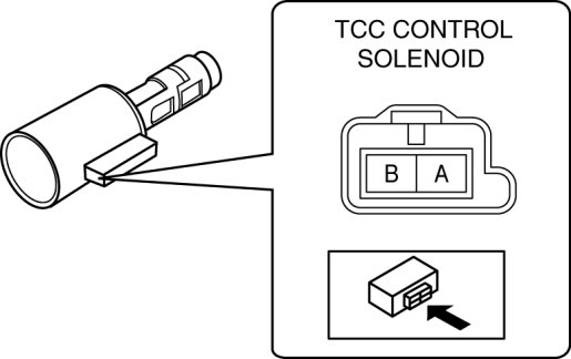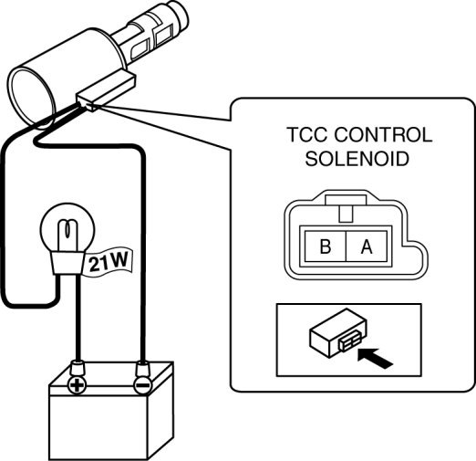 1. Connect the positive battery terminal to terminal B of TCC control solenoid via the 12-21 W bulb and connect the negative battery terminal to terminal A of TCC control solenoid.