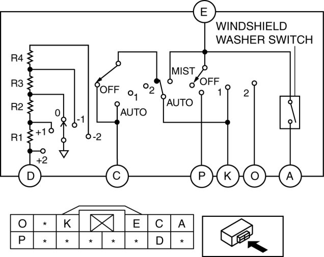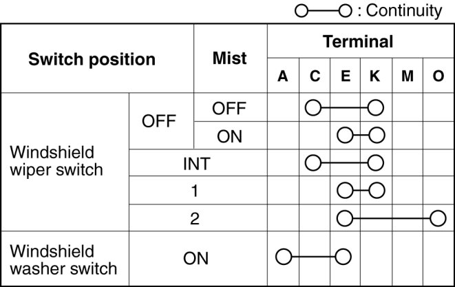 5. Verify that the continuity between the windshield wiper and washer switch is as indicated in the table.