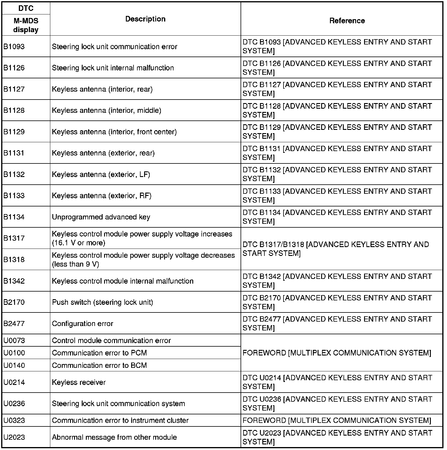 DTC TABLE [ADVANCED KEYLESS ENTRY AND START SYSTEM]