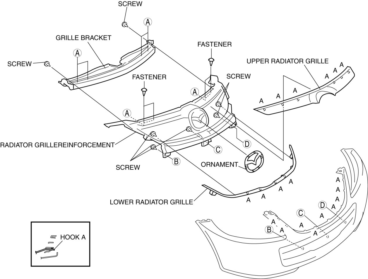 7. Remove the hooks A, while remove the upper radiator grille.