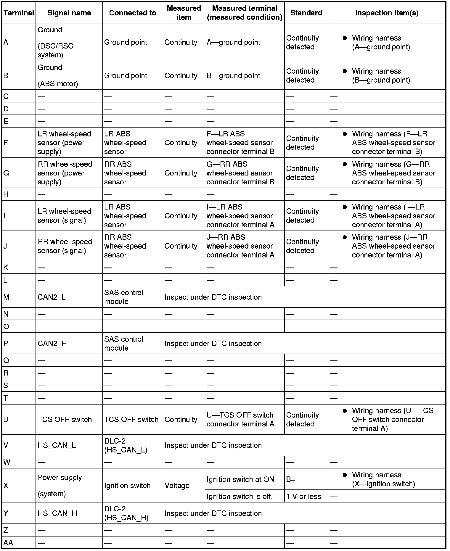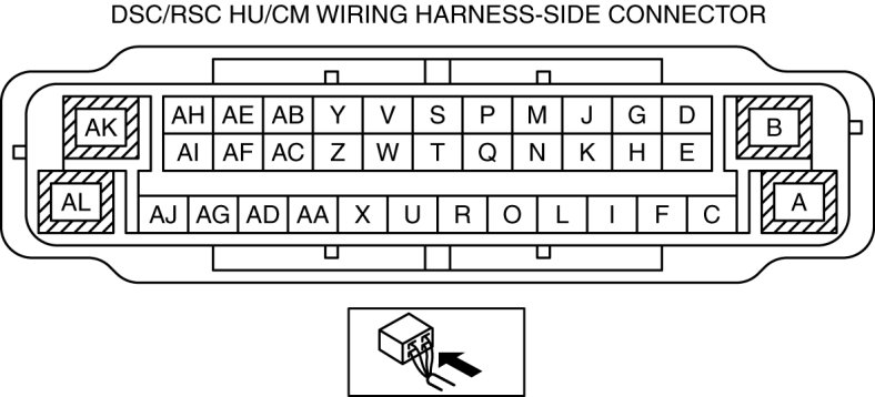 3. Attach the tester lead to the DSC/RSC HU/CM harness side connector, then inspect voltage, continuity or resistance according to the standard (reference value) on the table.