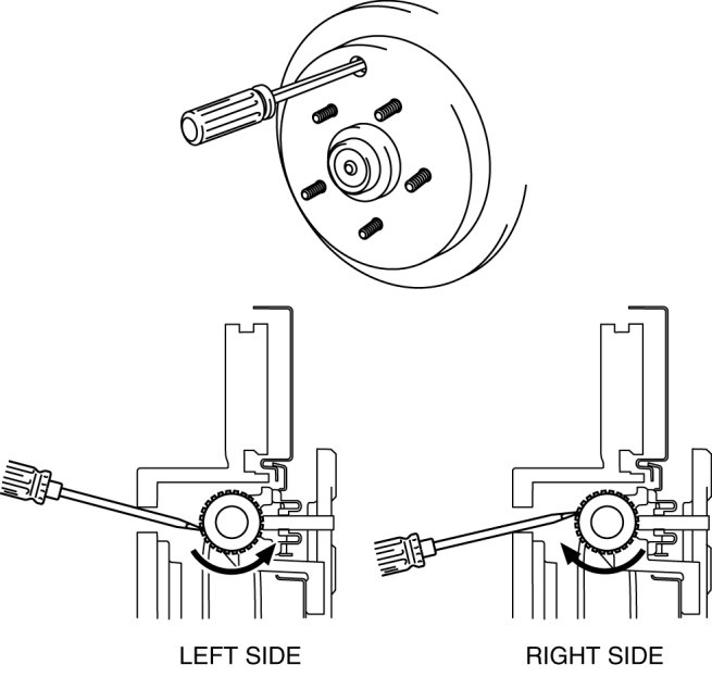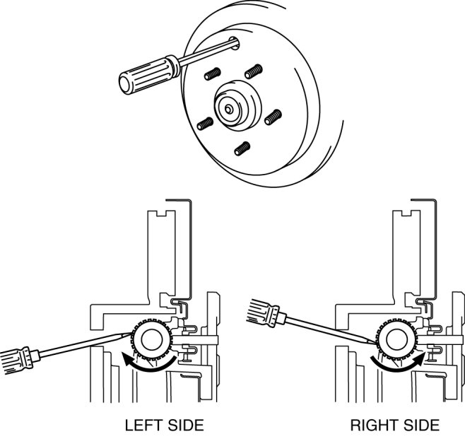 a. Insert a flathead screwdriver into the service hole and turn the adjuster in the direction of the arrow to expand the parking brake shoe until the disc plate cannot rotate.