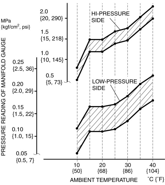 10. Verify that the intersection of the pressure reading of the manifold gauge and ambient temperature is in the shaded zone.