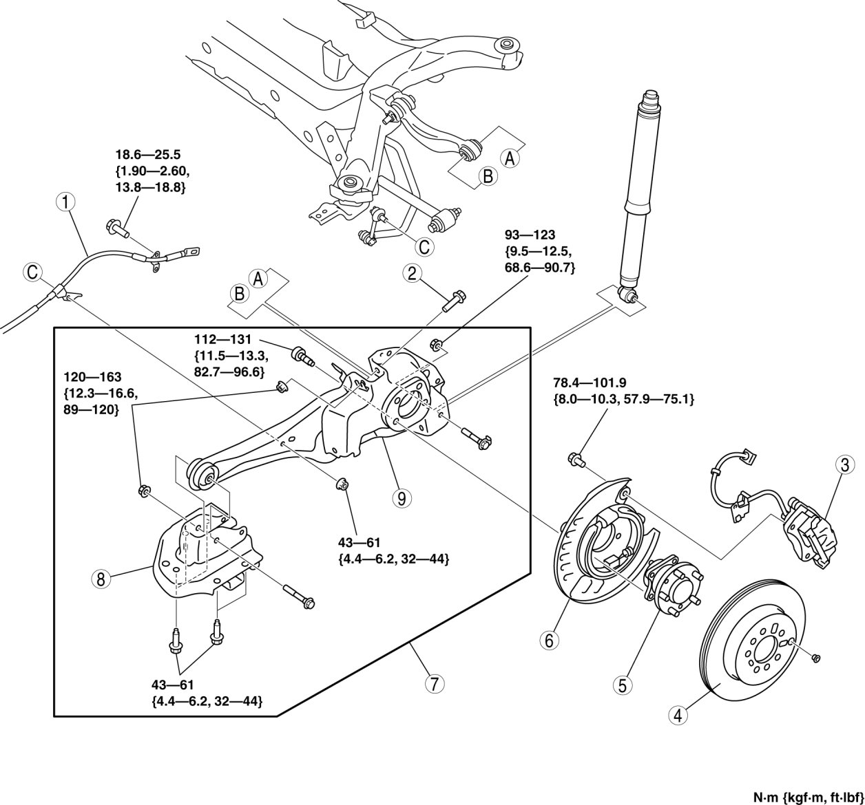 - Performing the following procedures without first removing the ABS wheel-speed sensor may possibly cause an open circuit in the harness if it is pulled by mistake. Before performing the following procedures, remove the ABS wheel-speed sensor (axle side) and fix it to an appropriate place where the sensor will not be pulled by mistake while servicing the vehicle.
