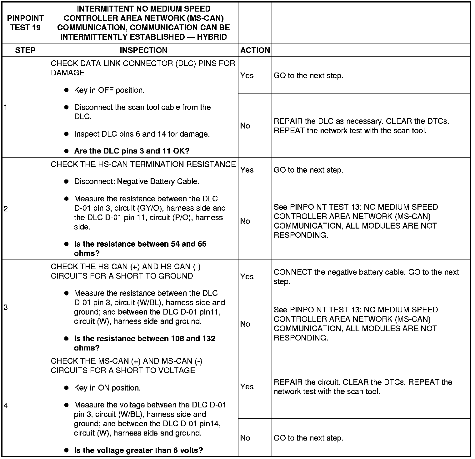 PINPOINT TEST 19: INTERMITTENT NO MEDIUM SPEED CONTROLLER AREA NETWORK (MS-CAN) COMMUNICATION, COMMUNICATION CAN BE INTERMITTENTLY ESTABLISHED - HYBRID