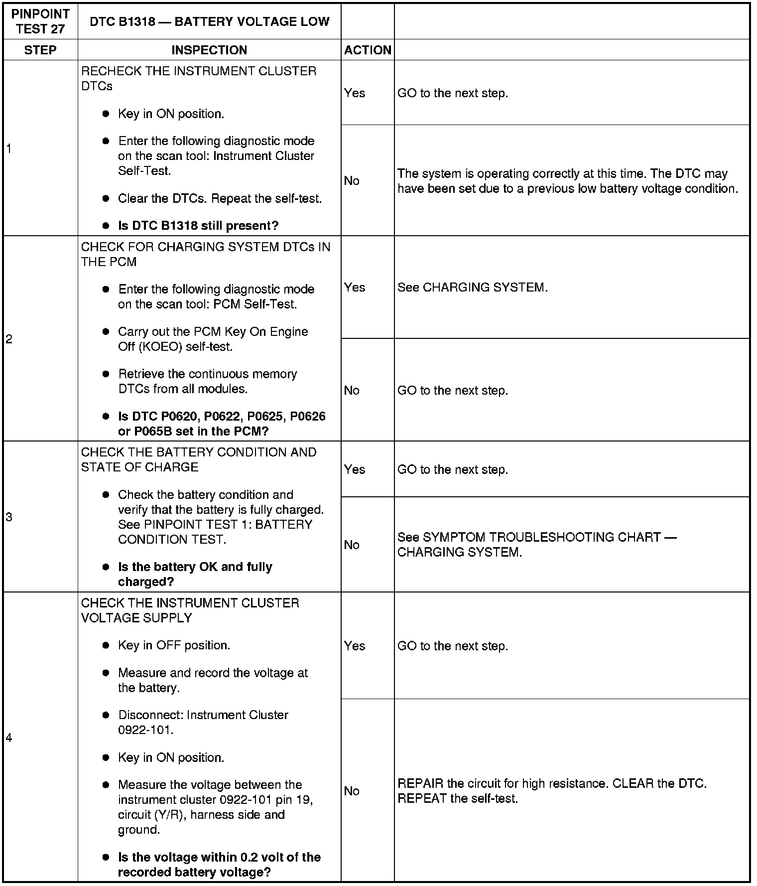 PINPOINT TEST 27: DTC B1318 - BATTERY VOLTAGE LOW
