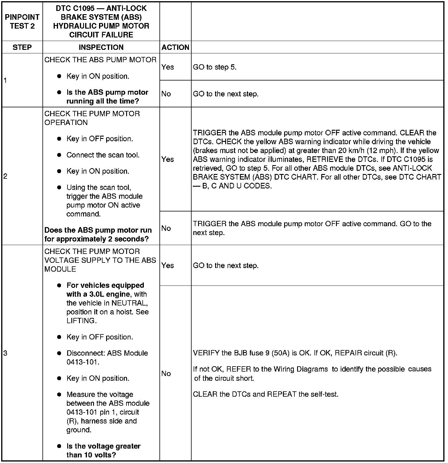 PINPOINT TEST 2: DTC C1095 - ANTI-LOCK BRAKE SYSTEM (ABS) HYDRAULIC PUMP MOTOR CIRCUIT FAILURE