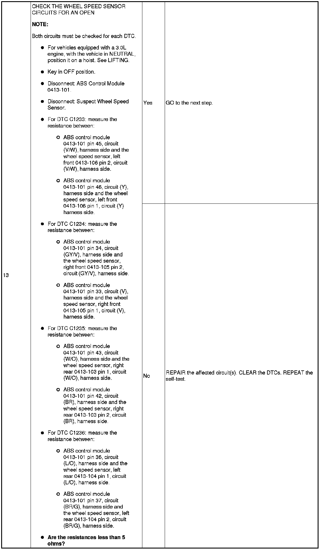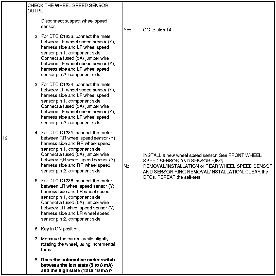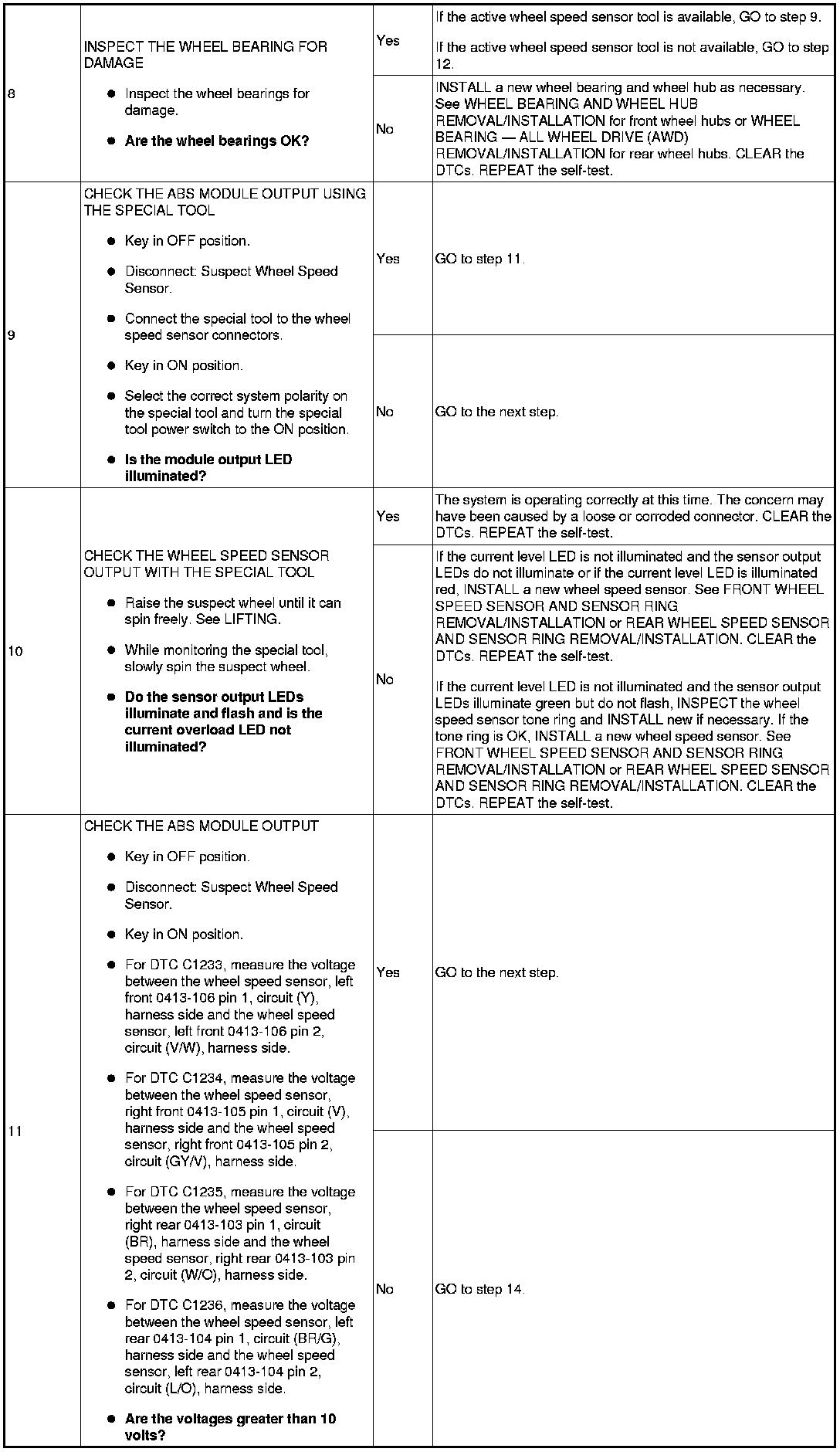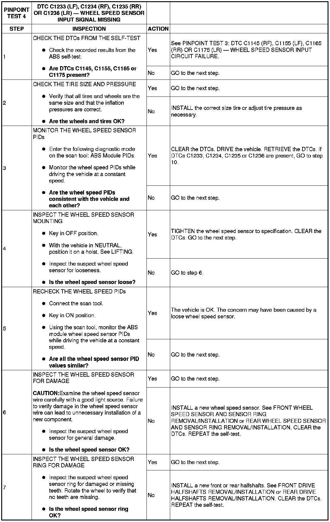 PINPOINT TEST 4: DTCs C1233 (LF), C1234 (RF), C1235 (RR) OR C1236 (LR) - WHEEL SPEED SENSOR INPUT SIGNAL MISSING