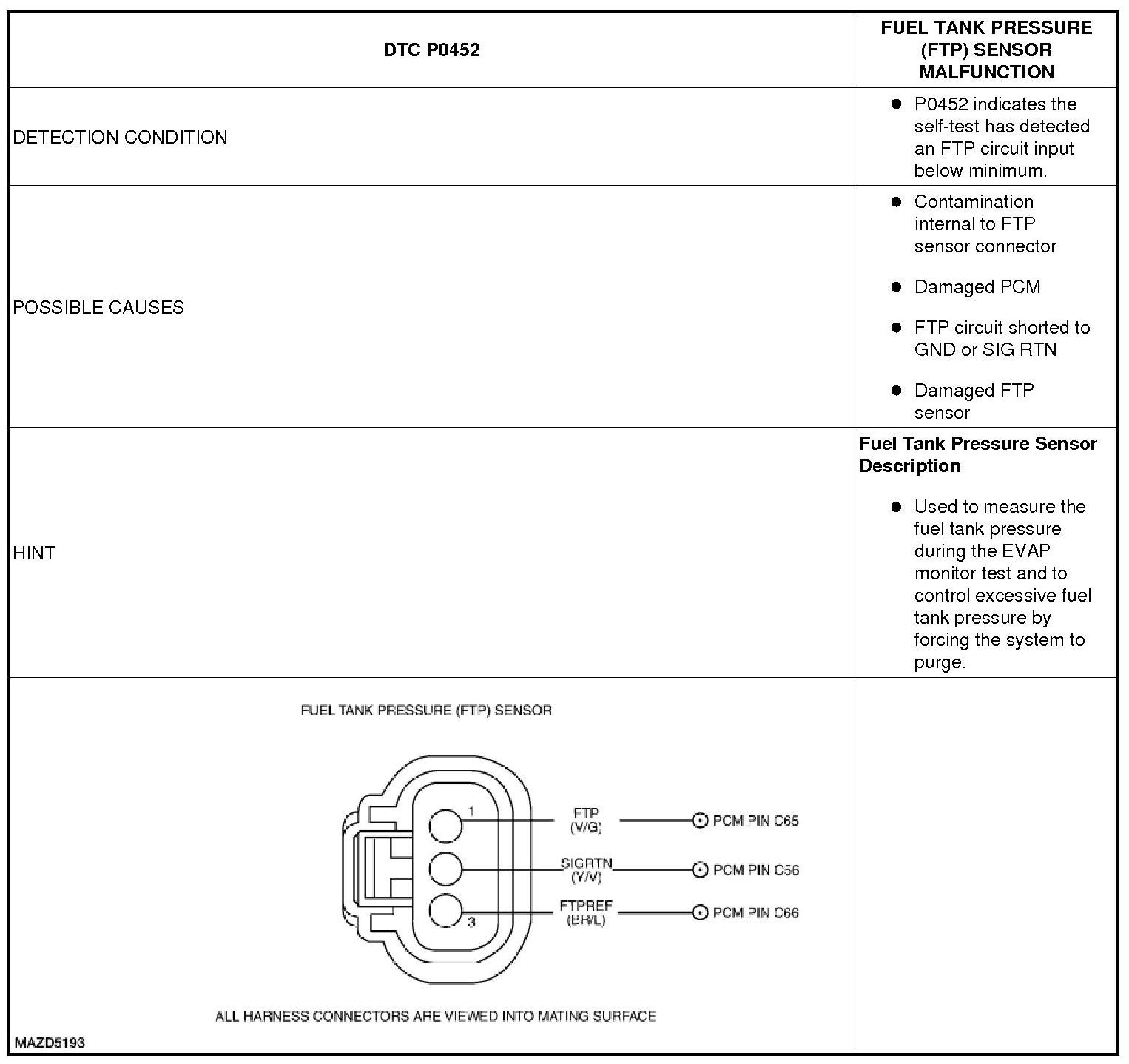 DTC P0452: FUEL TANK PRESSURE (FTP) SENSOR MALFUNCTION