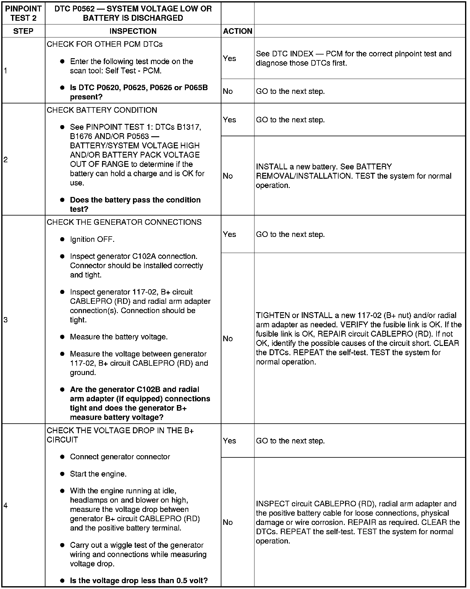 PINPOINT TEST 2: DTC P0562 - SYSTEM VOLTAGE LOW OR BATTERY IS DISCHARGED