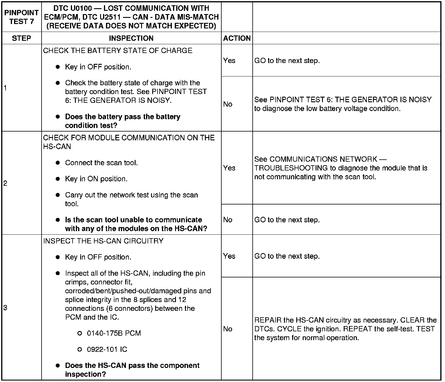 PINPOINT TEST 7: DTC U0100 - LOST COMMUNICATION WITH ECM/PCM, DTC U2511 - CAN - DATA MIS-MATCH (RECEIVE DATA DOES NOT MATCH EXPECTED)