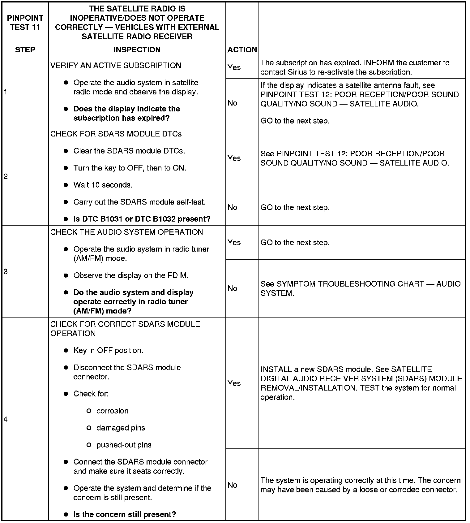 PINPOINT TEST 11: THE SATELLITE RADIO IS INOPERATIVE/DOES NOT OPERATE CORRECTLY - VEHICLES WITH EXTERNAL SATELLITE RADIO RECEIVER