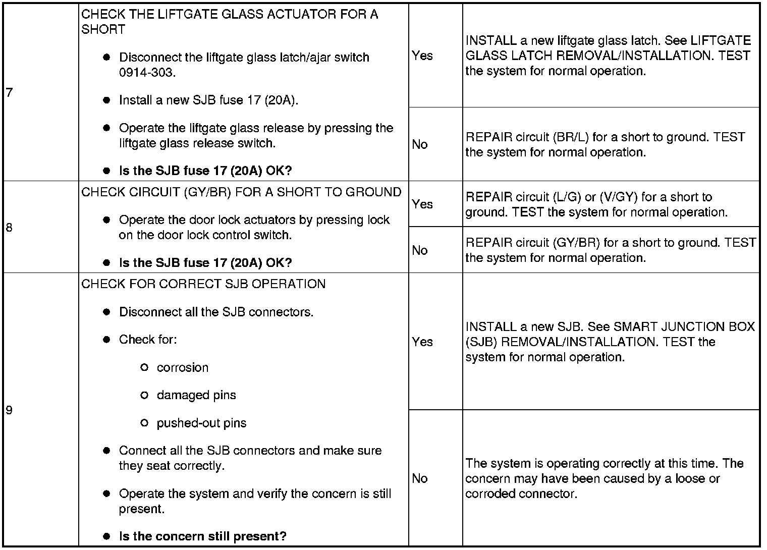 When the SJB receives a lock request from a door lock control switch, the SJB provides power to the door lock actuators through circuit (GY/BR). Ground for the left front door lock actuator is provided through circuit (L/G) and ground for the remaining door lock actuators is provided through circuit (V/GY). When the SJB receives an unlock request, power and ground are reversed on the previously listed circuits.
