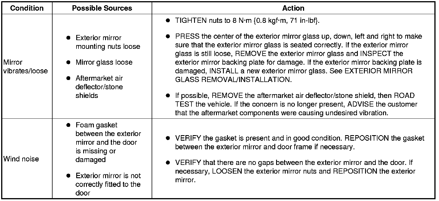 SYMPTOM TROUBLESHOOTING CHART - POWER MIRRORS - NOISE, VIBRATION AND HARSHNESS