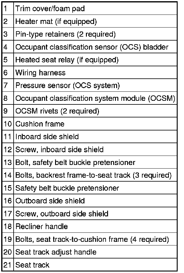 NOTE:Occupant classification sensor (OCS) system components (seat wiring harness, seat cushion foam pad, bladder with pressure sensor and occupant classification system module [OCSM]) are calibrated to each other and are serviced as an assembly. The OCS system components are not to be installed separately. If a new OCS system, OCS system component or seat cushion foam pad are needed, an OCS system service kit (seat cushion foam pad, bladder with pressure sensor, seat wiring harness and OCSM) must be installed as an assembly.To identify between a production OCS system and a OCS system service kit, inspect the OCSM electrical connector.A production OCS system allows the disconnection of the OCSM electrical connector. An OCS system service kit has the electrical connector glued to the module, it cannot and should not be disconnected or altered. The air bag warning indicator illuminates when the restraints control module (RCM) fuse is removed and the ignition switch is ON. This is normal operation and does not indicate a supplemental restraint system (SRS) fault.The SRS must be fully operational and free of faults before releasing the vehicle to the customer. The heated seat element on the front passenger seat cushion is not serviceable separately. If a new heated seat element is needed on the front passenger seat cushion, a new occupant classification sensor (OCS) service kit equipped with a heated seat element must be installed.The passenger seat is equipped with an OCS system and is replaced as an assembly.
