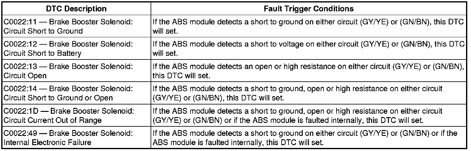 The brake booster solenoid is internal to the brake booster. During normal braking, the ABS module will apply a pulse-width modulation (PWM) voltage to the brake booster solenoid along circuit (GY/YE). The ABS module will provide ground to the solenoid along circuit (GN/BN). The ABS module constantly checks the integrity of the booster solenoid and circuits. If circuit (GY/YE), circuit (GN/BN) or the booster solenoid is open, shorted to ground or has high resistance, a DTC will set. If a booster solenoid fault is detected the brake system will transition from brake-by-wire mode to conventional friction braking. Other DTCs for brake booster performance may set as a result of a brake booster solenoid circuit fault. The brake booster solenoid cannot be serviced separately from the brake booster. If a new brake booster solenoid is needed, a new brake booster must be installed.