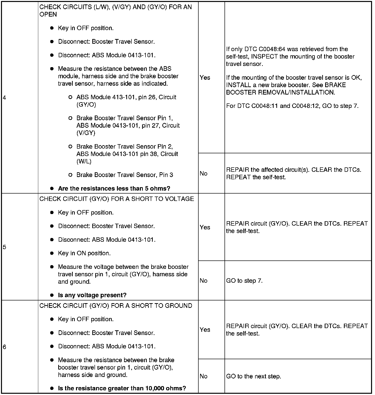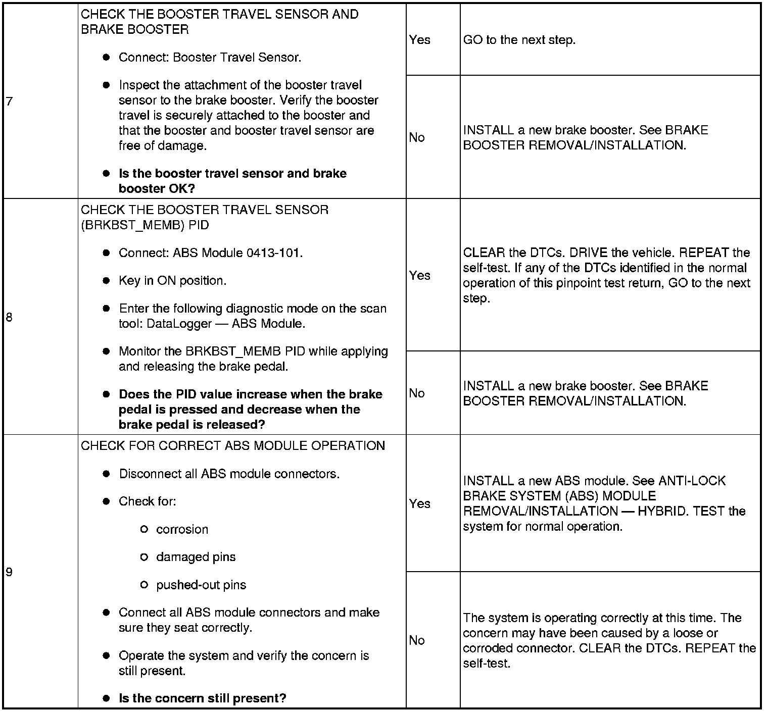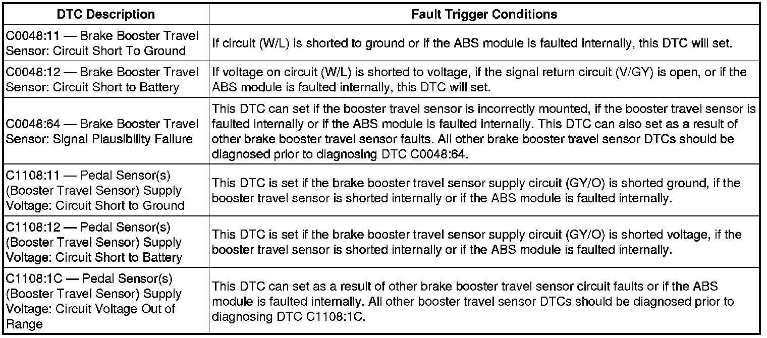 The booster travel sensor provides the ABS module with analog signal indicating the position of the diaphragm inside the brake booster. The ABS module supplies a reference voltage to the sensor along circuit (W/L) and ground along circuit (V/GY). The ABS module receives a varying voltage proportional to the position of the diaphragm inside the brake booster along circuit (GY/O). The ABS module monitors the brake booster travel sensor circuits for circuit faults. The ABS module will also compare the brake booster travel sensor signal with other brake system inputs to verify that the brake booster travel sensor signal is accurate. If a brake booster travel sensor circuit or signal fault is detected, the red brake warning indicator will be illuminated.