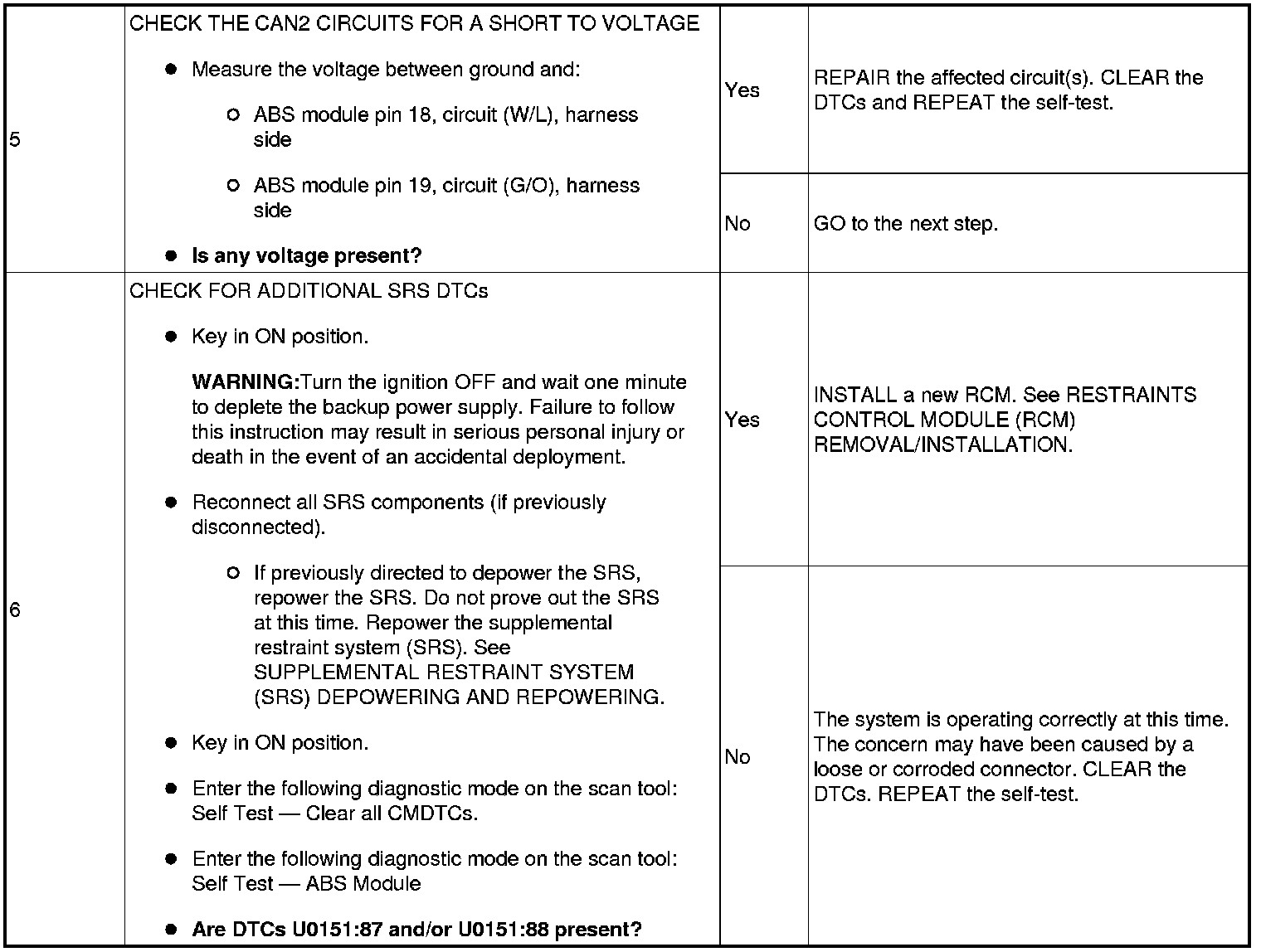 - DTC U0151:88 (Lost Communication With Restraints Control Module: Bus Off) - this DTC can set if either of the CAN2 circuit (L/W) or (G/O) are open, shorted to ground, or shorted to each other. Other DTCs indicating missing messages or invalid signal from the electronic stability control (ESC) sensors can set as a result of a CAN2 bus fault.