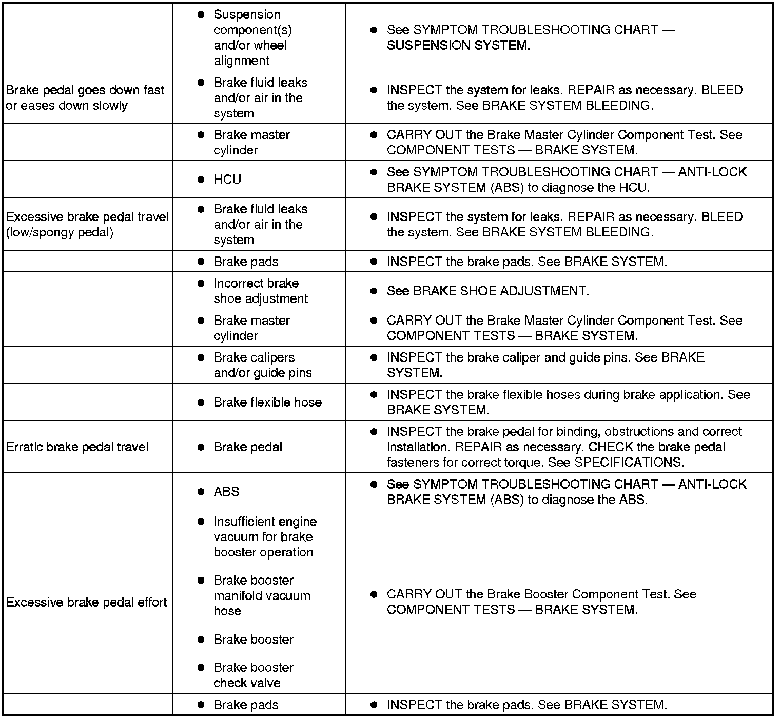 SYMPTOM TROUBLESHOOTING CHART - CONVENTIONAL BRAKE SYSTEM