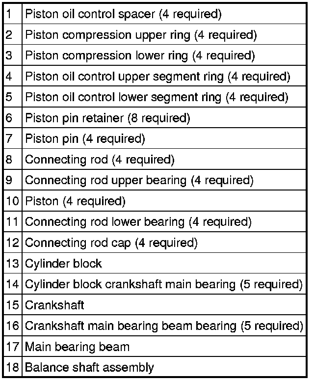 NOTE:Assembly of the engine requires various inspections/measurements of the engine components (engine block, crankshaft, connecting rods, pistons and piston rings). These inspections/measurements will aid in determining if the engine components will require replacement. See Engine Technical Data.
