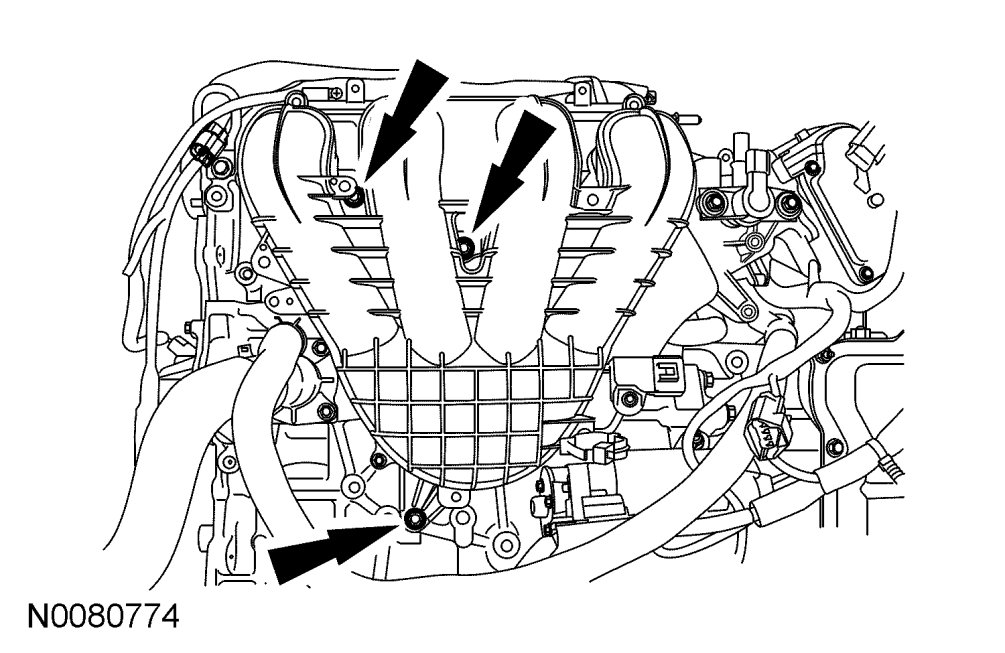 CAUTION:If the engine is repaired or replaced because of upper engine failure, typically including valve or piston damage, check the intake manifold for metal debris. If metal debris is found, install a new intake manifold. Failure to follow these instructions can result in engine damage.
