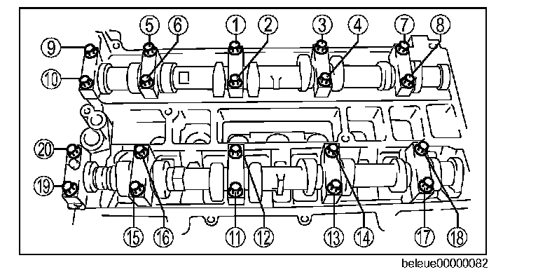 5. Tighten the camshaft cap bolts in the order shown with the following two steps.