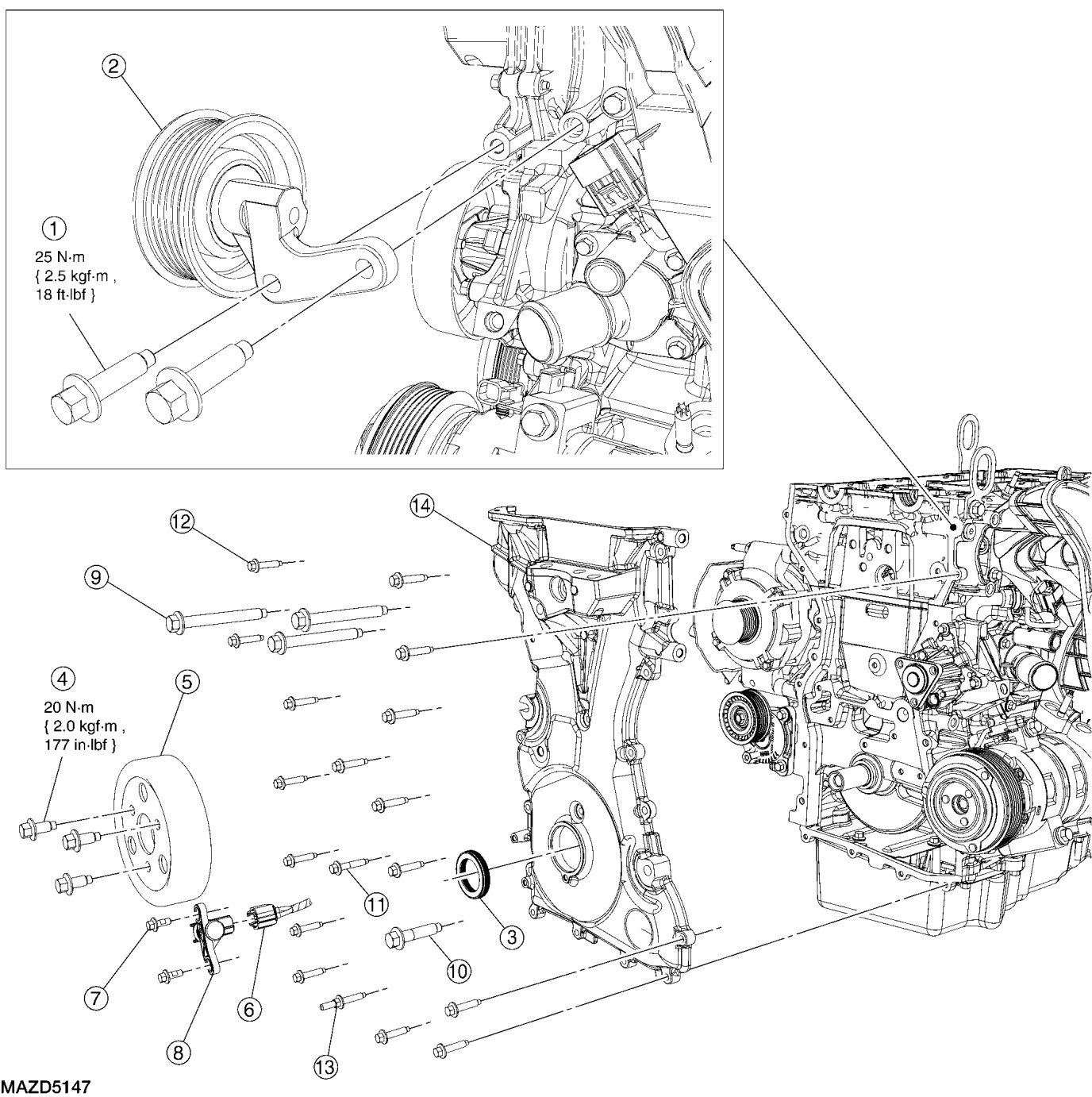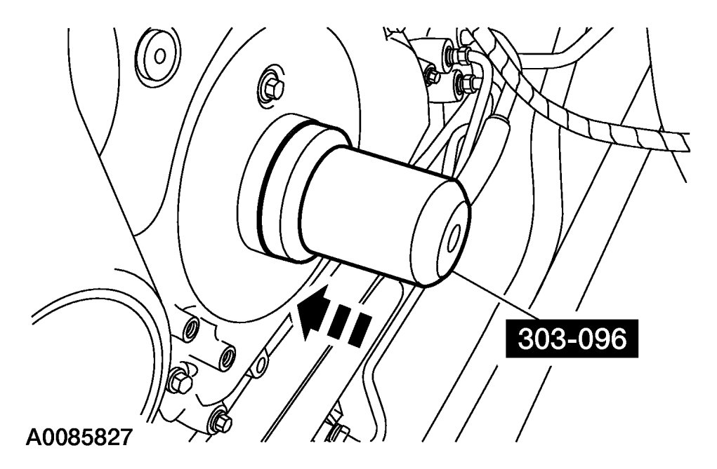 CAUTION:Do not loosen or remove the crankshaft pulley bolt without first installing the service tools as instructed in this procedure. The crankshaft pulley and the crankshaft timing sprocket are not keyed to the crankshaft. The crankshaft, the crankshaft sprocket and the pulley are fitted together by friction, using diamond washers between the flange faces on each part. For that reason, the crankshaft sprocket is also unfastened if the pulley bolt is loosened. Before any repair requiring loosening or removal of the crankshaft pulley bolt, the crankshaft and camshafts must be locked in place by the service tools, otherwise severe engine damage can occur.