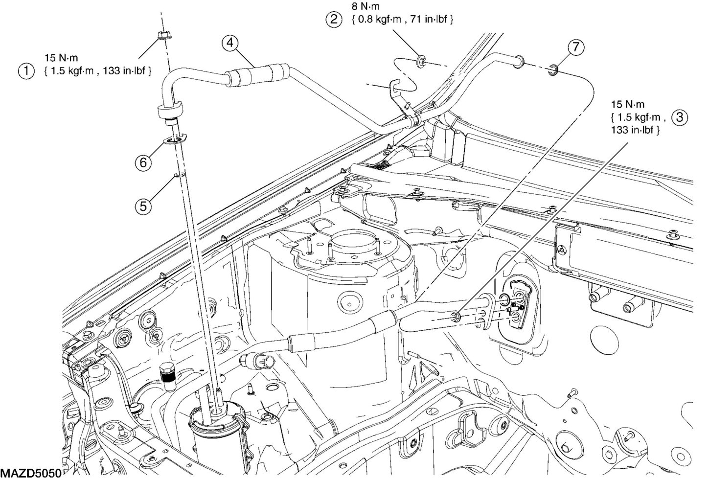 - To install, tighten to 15 Nm {1.5 kgf-m, 133 in-lbf}.