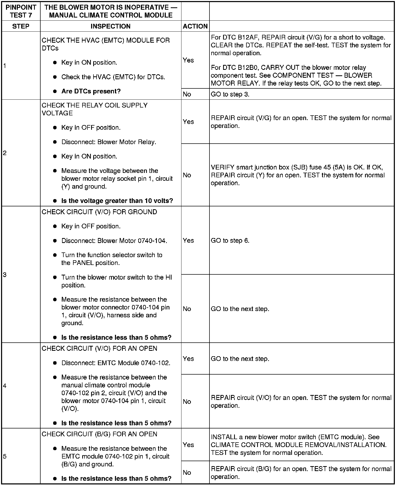 PINPOINT TEST 7: THE BLOWER MOTOR IS INOPERATIVE - MANUAL CLIMATE CONTROL MODULE