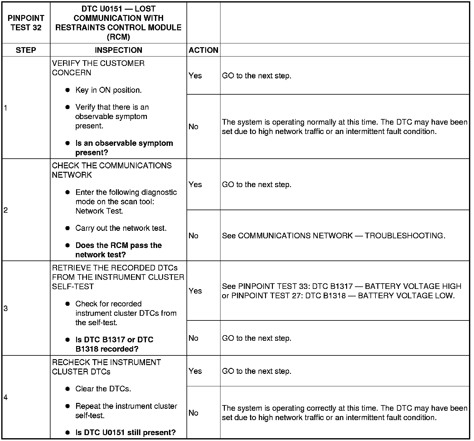 PINPOINT TEST 32: DTC U0151 - LOST COMMUNICATION WITH RESTRAINTS CONTROL MODULE (RCM)