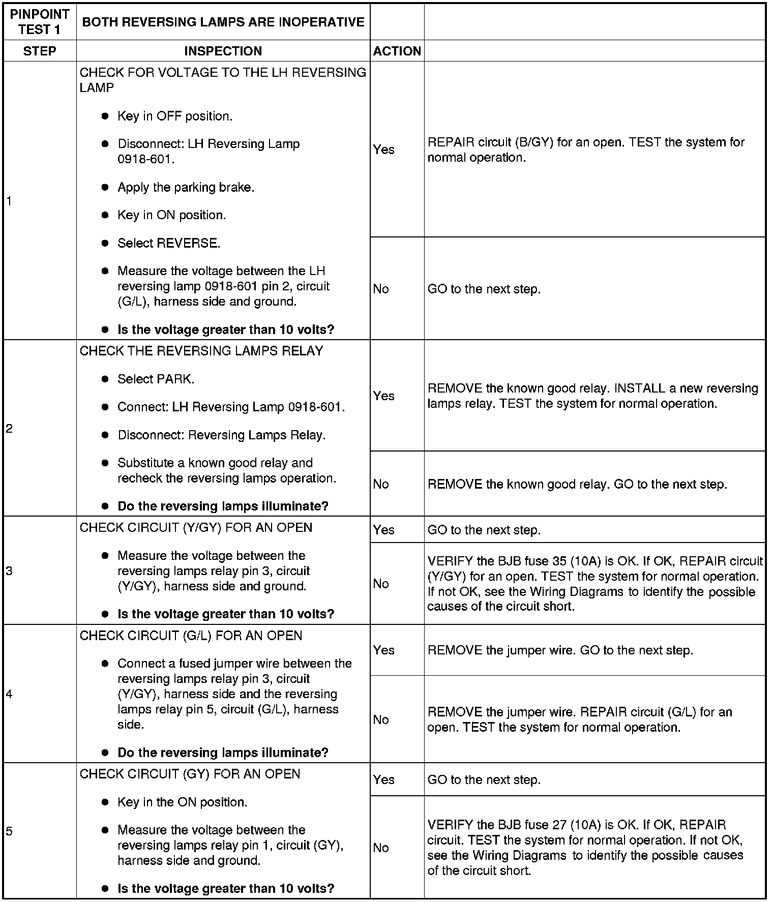 Voltage is supplied from the battery junction box (BJB) fuse 27 (10A) to the coil side of the reversing lamps relay through circuit (GY). The reversing lamps relay switch side is supplied voltage by the BJB fuse 35 (10A) through circuit (Y/GY). The reversing lamps relay coil ground is controlled by the PCM (automatic transaxle) or the reversing lamp switch (manual transaxle) through circuit (L/W).