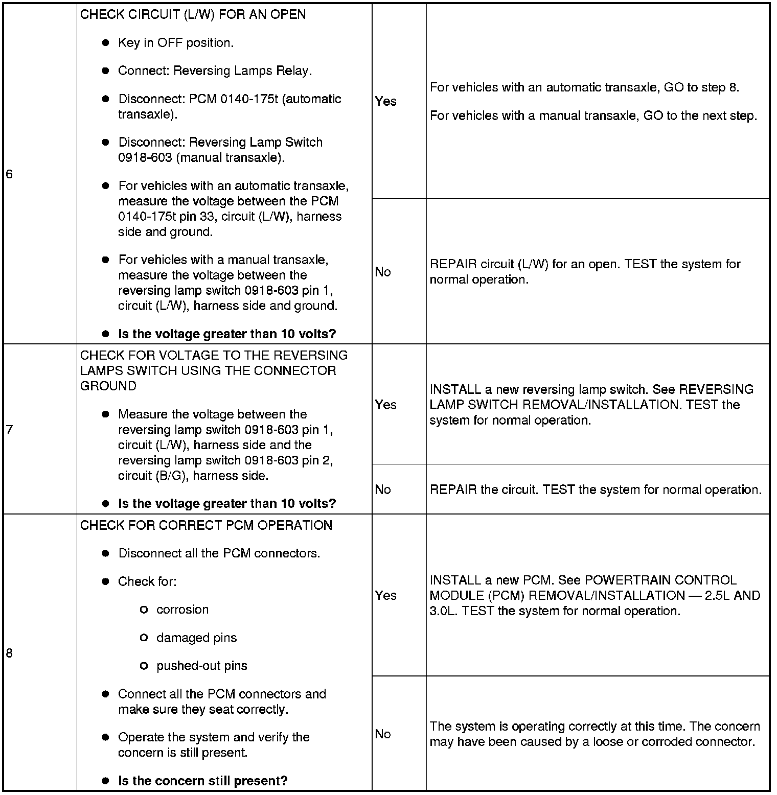 For vehicles with an automatic transaxle, when the transaxle is in REVERSE (R), the PCM provides ground to energize the reversing lamps relay.For vehicles with a manual transaxle, when the transaxle is in REVERSE (R), the reversing lamp switch completes the ground path through circuit (B/G) to energize the reversing lamps relay.When the reversing lamps relay is energized, voltage is routed to the reversing lamps through circuit (G/L). The reversing lamps share a common ground through circuit (B/GY).