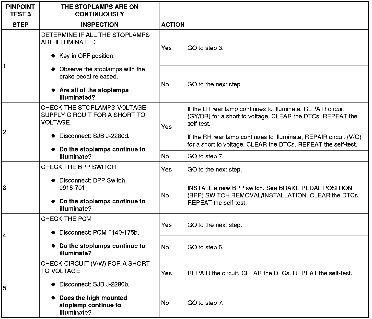 PINPOINT TEST 3: THE STOPLAMPS ARE ON CONTINUOUSLY