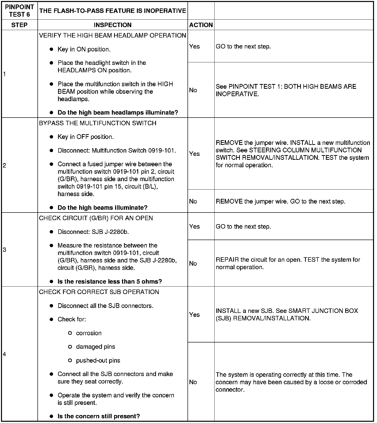 The smart junction box (SJB) sends a reference signal to the multifunction switch through circuit (G/BR). When the multifunction switch is placed in the FLASH-TO-PASS position, the voltage signal is routed to ground. When the SJB detects a request for the flash-to-pass, the SJB energizes the high beam relay (integrated into the SJB), which supplies voltage to the headlamps.