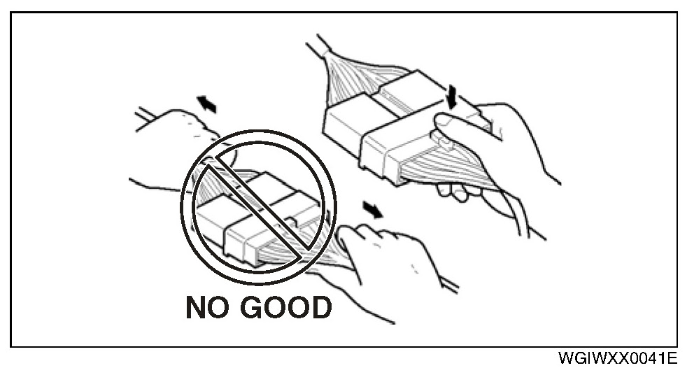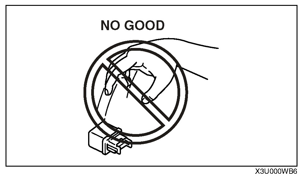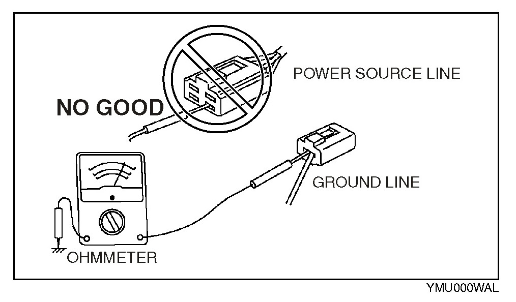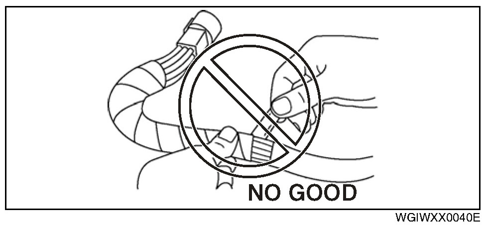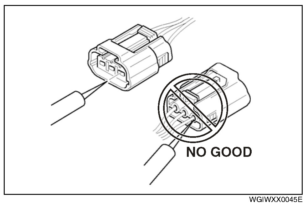 - When a tester is used to inspect for continuity or measuring voltage, insert the tester probe from the wiring harness side.