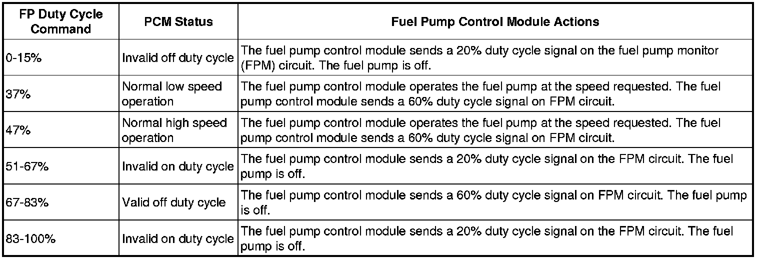 The fuel pump control module communicates diagnostic information to the PCM through the FPM circuit. This information is sent by the fuel pump control module as a duty cycle signal. The 4 duty cycle signals that may be sent are listed in the following table. Fuel Pump Driver Module Duty Cycle Signals
