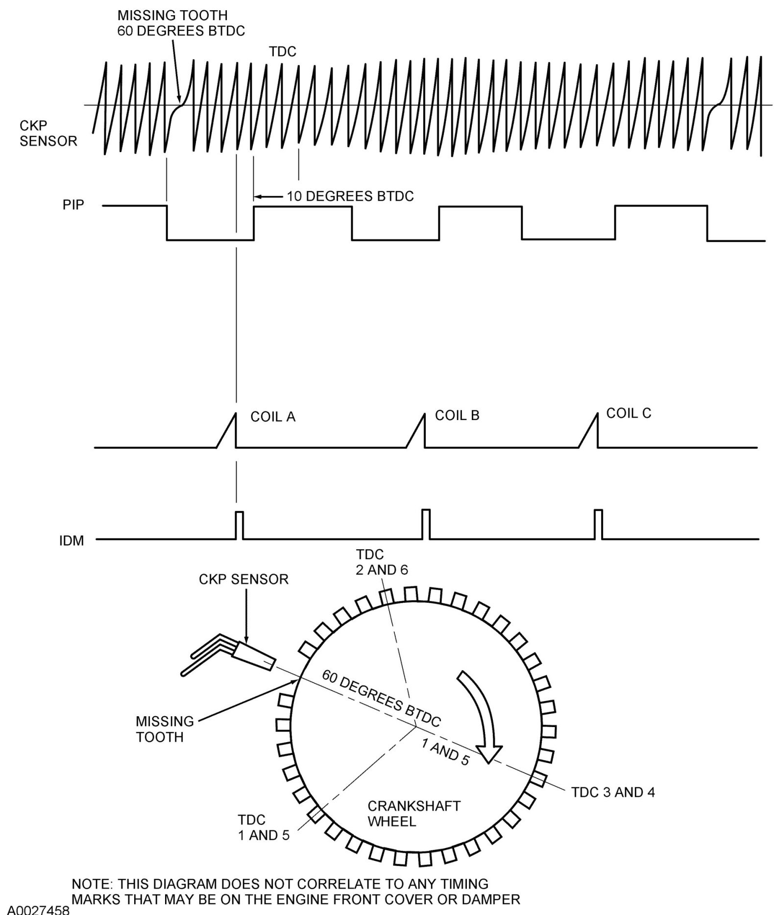 1. The CKP sensor is used to indicate the crankshaft position and speed by sensing a missing tooth on a pulse wheel mounted to the crankshaft. The CMP sensor is used by the COP integrated electronic ignition system to identify the compression stroke of cylinder 1 and to synchronize the firing of the individual coils.
