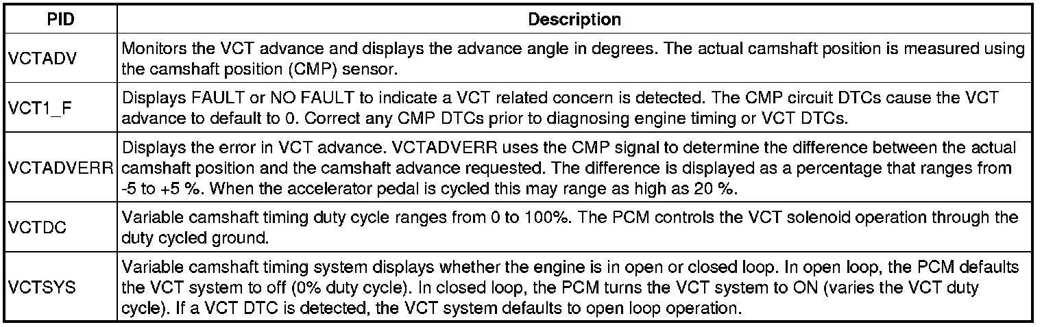 4. The VCT solenoid valve is an integral part of the VCT system. The solenoid valve controls the flow of engine oil in the VCT actuator assembly. As the PCM controls the duty cycle of the solenoid valve, oil pressure/flow advances or retards the cam timing. Duty cycles near 0% or 100% represent rapid movement of the camshaft. Retaining a fixed camshaft position is accomplished by dithering (oscillating) the solenoid valve duty cycle.The PCM calculates and determines the desired camshaft position. It continually updates the VCT solenoid duty cycle until the desired position is achieved. A difference between the desired and actual camshaft position represents a position error in the PCM VCT control loop. The PCM disables the VCT and places the camshaft in a default position if a concern is detected. A related DTC is also set when the concern is detected.