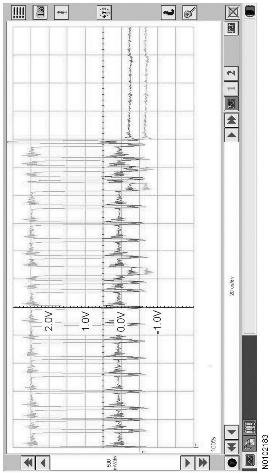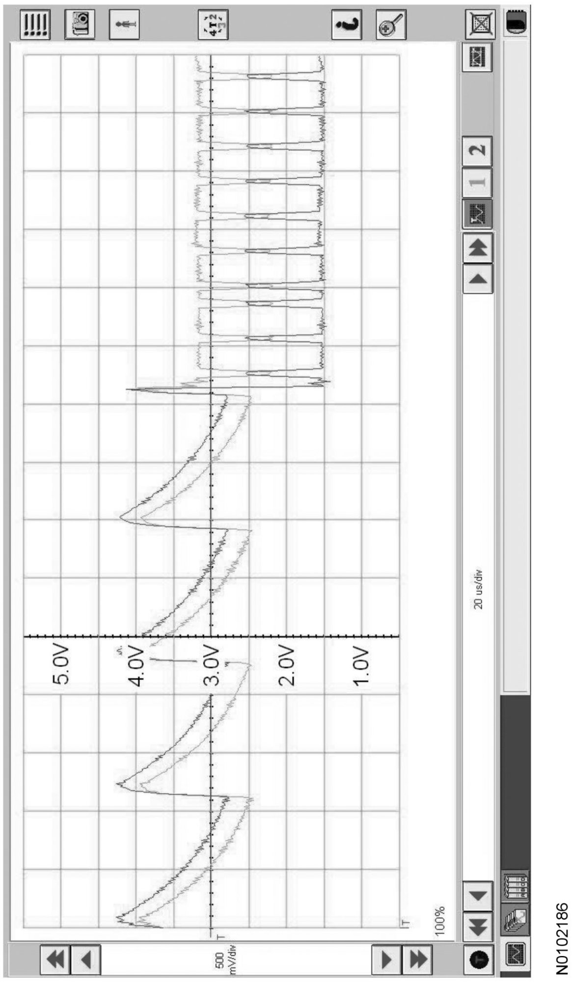 Traces below are viewed at 500mV per division (vertical axis) and 20 microseconds (20μs) per division (horizontal axis). Readings taken with a different oscilloscope vary from those shown. Compare any suspect readings to a known good vehicle.