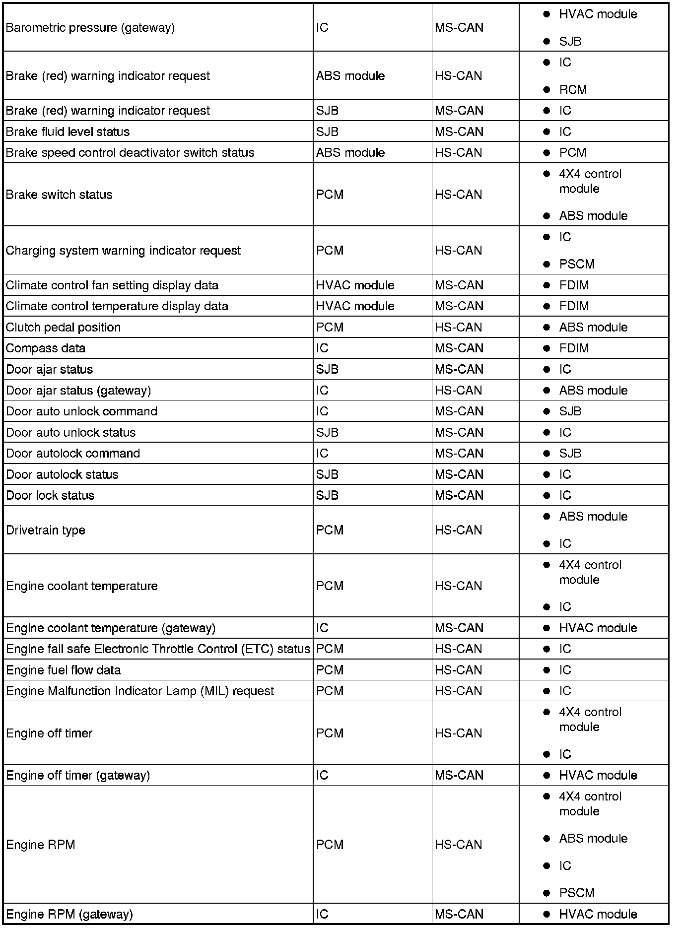 Modules on the CAN utilize simultaneous communication of 2 or more messages on the same network circuits. The following chart summarizes the messages sent and received on the network.