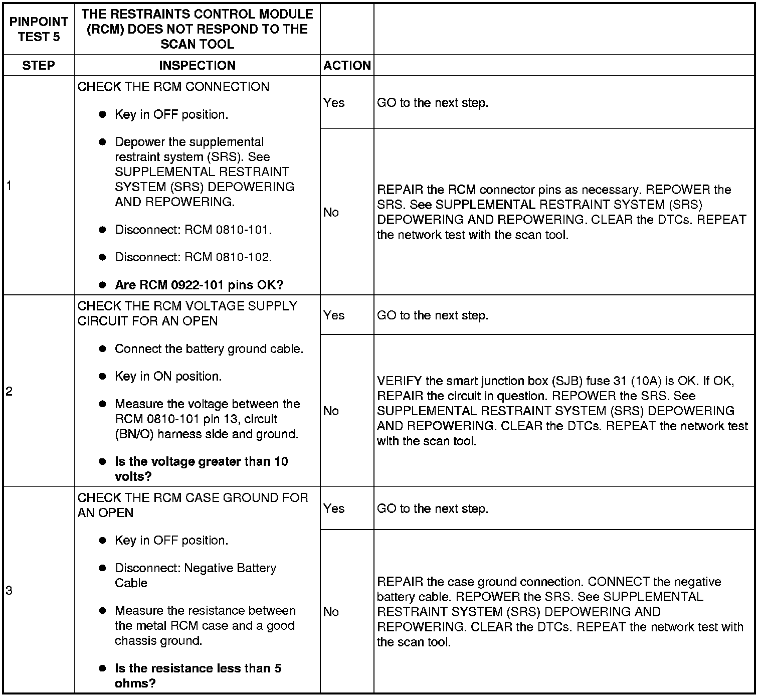 PINPOINT TEST 5: THE RESTRAINTS CONTROL MODULE (RCM) DOES NOT RESPOND TO THE SCAN TOOL