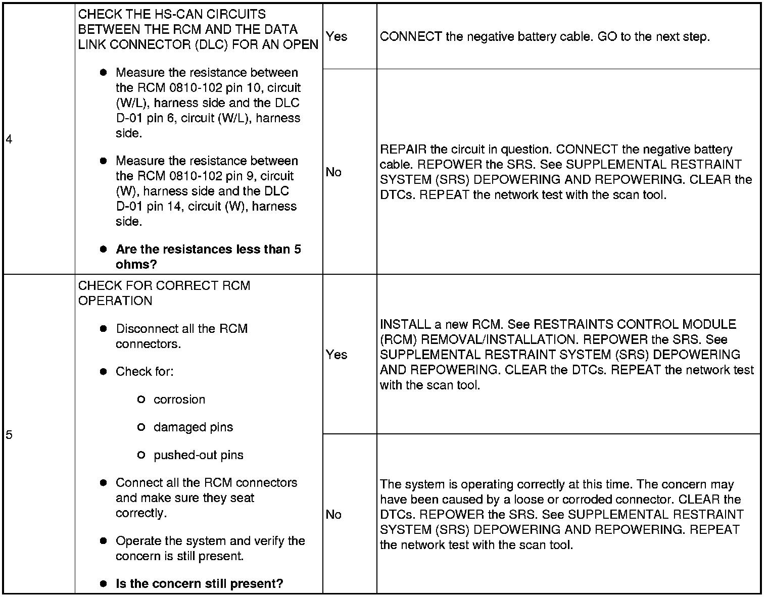 The restraints control module (RCM) communicates with the scan tool through the high speed controller area network (HS-CAN). Circuits (W/L) (HS-CAN +) and (W) (HS-CAN -) provide the HS-CAN connection to the RCM. The RCM shares the HS-CAN with the PCM, the ABS module, the 4X4 control module, the instrument cluster (IC), the power steering control module (PSCM) and the occupant classification sensor module (OCSM). Voltage for the RCM is provided by circuits (G/V) and the RCM is case grounded.