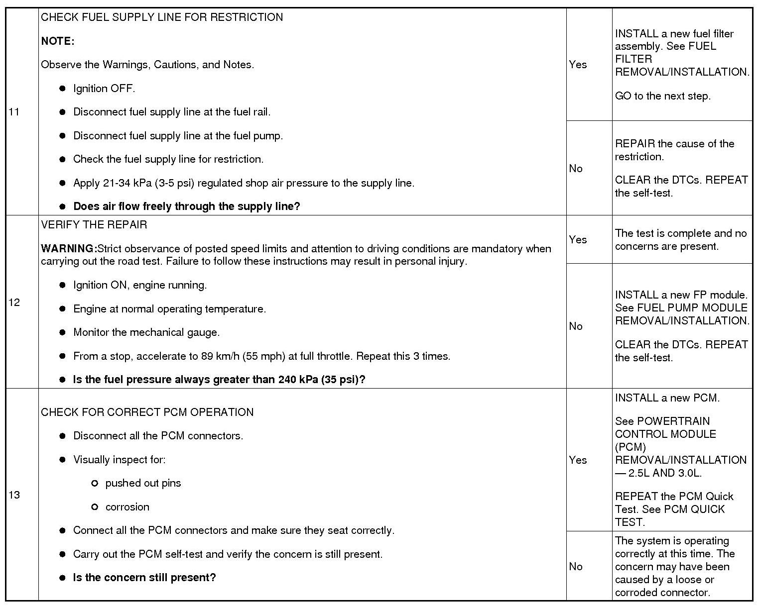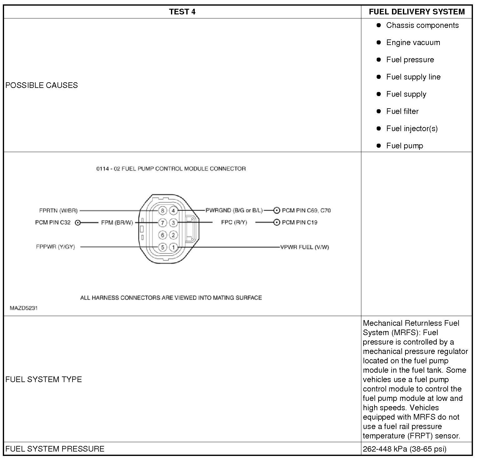 WARNING:The fuel system remains under pressure after the engine is off. Relieve pressure before repairing. Highly flammable mixtures are present. To release pressure from the fuel system, carry out the following:Connect Fuel Pressure Test Kit 310-D009 (D95L-7211A) or equivalent.Gradually open the testing kit valve to relieve the fuel pressure in the vehicle fuel system and drain the fuel into a suitable container or return it to the fuel tank.To avoid unnecessary fuel spillage and fire hazard, any time fuel lines are disconnected, the ignition switch must be in the OFF position unless fuel pump operation is required for test purposes.Failure to follow these instructions may result in personal injury.