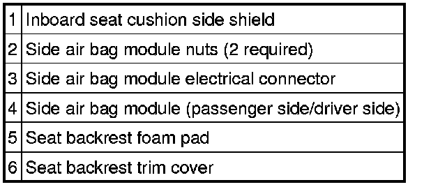 NOTE:If a side air bag deployment took place, a new seat back pad, trim cover, side air bag module and nuts must be installed. The seat back frame should be replaced if necessary. For additional information, see Front Seat Backrest Disassembly/Assembly.